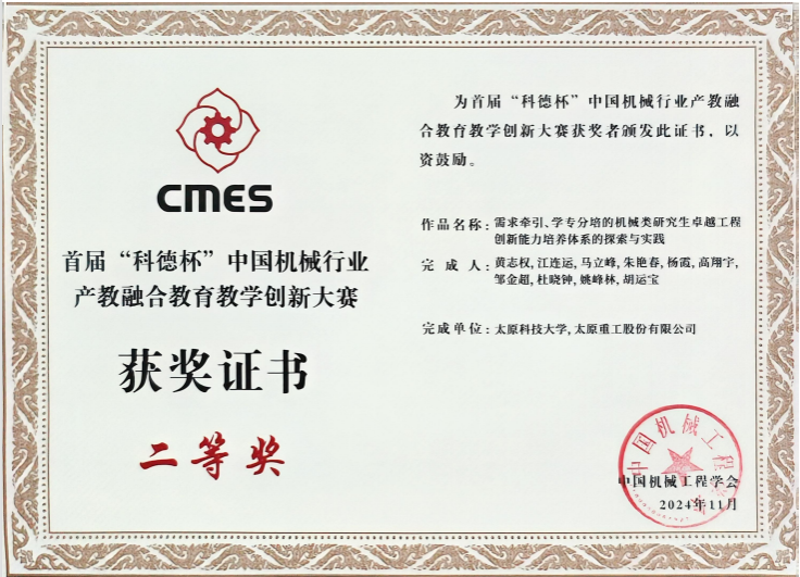 11月22日至11月25日,首届“科德杯”中国机械行业产教融合教育教学创新大赛国赛在浙江省杭州市浙江大学顺利举办。beat365官网参赛作品分别在研究生组、本科组荣获国赛二等奖。