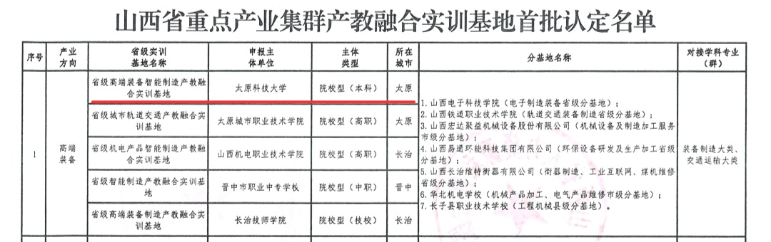 近日,山西省发展和改革委员会等部门联合下发《关于认定首批山西省重点产业集群产教融合实训基地的通知》(晋发改科教发〔2024〕313号),beat365官网牵头建设的高端装备智能制造产教融合实训基地成功入选首批认定的省级产教融合实训基地。
