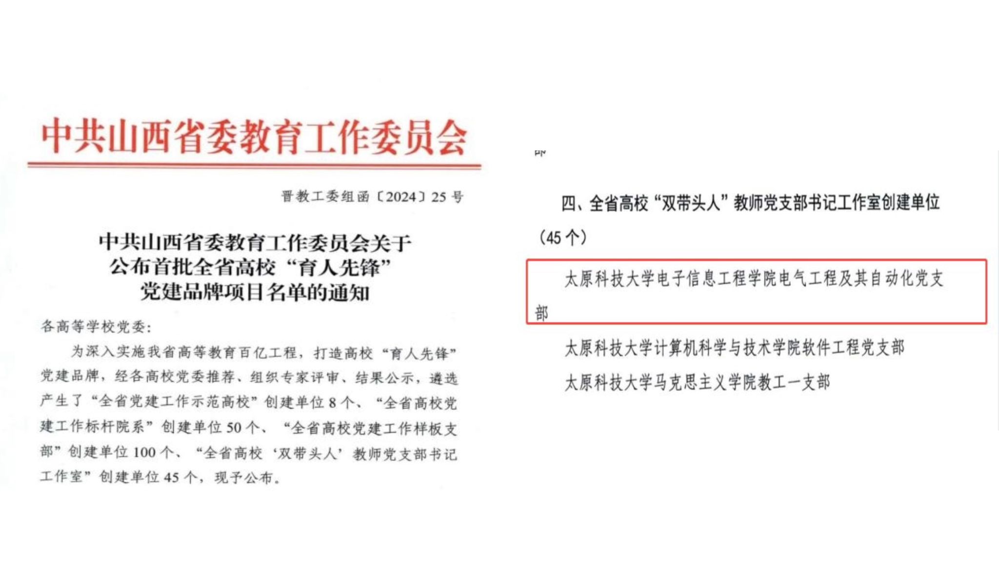 2024年山西省委教育工委公布了教育系统党建创新案例评选结果,学院党委《“VR+党建”,科技赋能党建工作》成功入选全省高校党建创新案例。在山西省高校“育人先锋”党建品牌项目中,学院电气工程及其自动化党支部入选全省高校“双带头人”教师党支部书记工作室创建单位。在beat365正版唯一官网必一百亿工程新时代高校党建示范创建和质量创优项目、“双带头人”培育项目中学院入选3项,学院党委入选党建工作标杆院系、电气工程及其自动化教师党支部入选“双带头人”教师党支部书记工作室创建单位,研究生第三党支部入选党建工作样板支部。