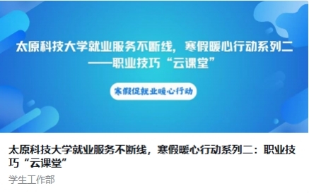 学校依托国家大学生就业服务平台、山西省24365大学生就业服务平台、学校就业信息网和学生就业指导中心微信公众号等专业网络招聘平台,面向全校学生开设求职技巧与职业生涯发展规划专家直播课程。邀请教育专家与企业专家担任讲师,围绕求职准备、自我成长、能力对标、职业规划等主题推出12期专题课程,累计服务全校学生3万余人次。
