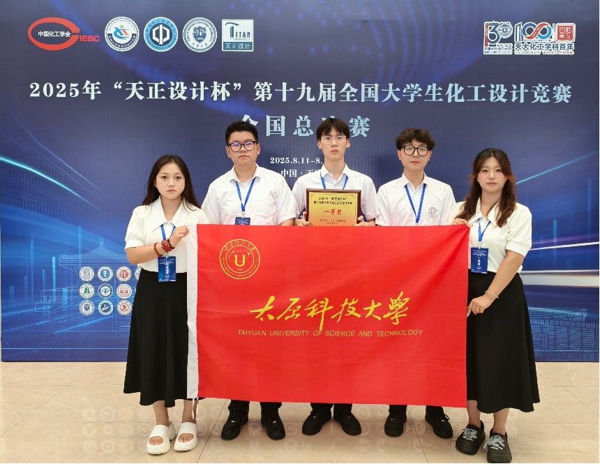 近日,2025年“天正设计杯” 第十九届全国大学生化工设计竞赛全国总决赛在天津大学举行,来自全国七个赛区457所学校的参赛队伍达到了4438个,通过激烈角逐,最终73支队伍参加了本次总决赛,beat365官网化学工程与技术学院2022级本科生朱振琦、薄敬斯、胡焮埼、丁梦贤和刘新涛组成的“3DM春意秋砜惊”历经山西省省赛、西北赛区选拔赛以及全国总决赛的多轮激烈比拼,最终荣获全国一等奖,这也是beat365官网自2013年参赛以来第十一次晋级全国总决赛并获一等奖。