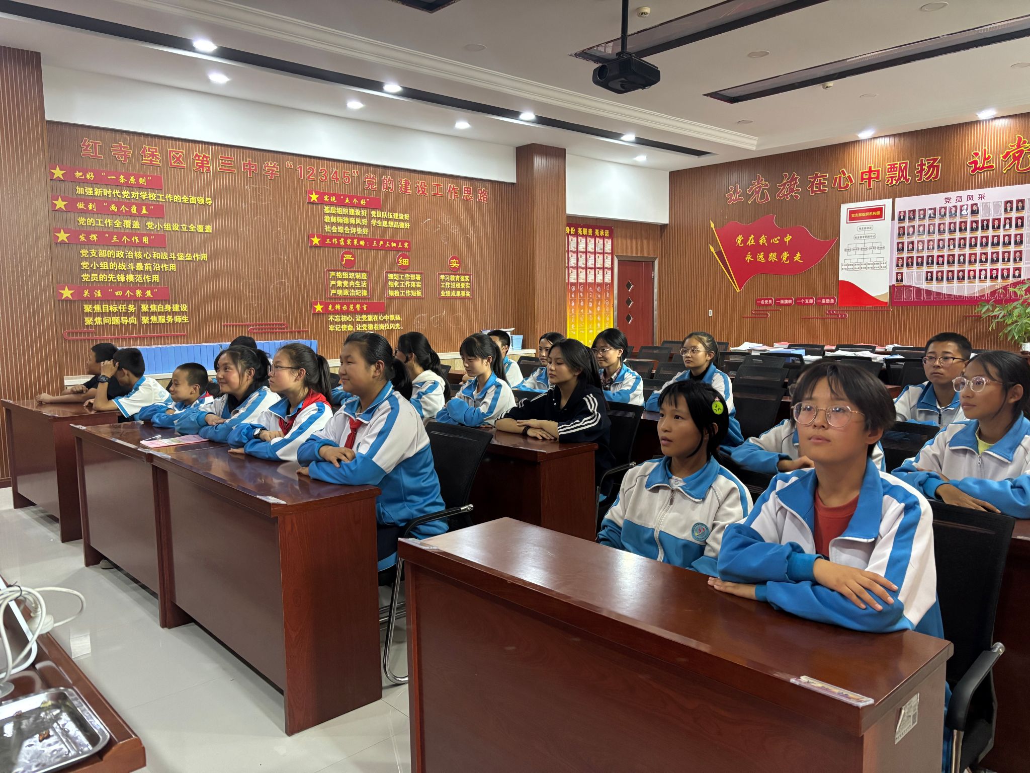党员们始终把思想政治引领放在首位。支教不是单打独斗,党员要当好团队的“黏合剂”和“发动机”,支教团临时党支部以“主题党日+教研”为抓手,开展“党员示范课”“教学难题会诊”等活动,推动支教团成员共同进步。党员、支教团成员杨李青的主要工作是负责三中党建工作和党员教师的组织生活;她深刻认识到党建工作对教师队伍思想引领的关键作用,主动在活动中与党员教师交流育人心得,积极探索优化工作路径、方法,着力持续提升党建服务质效,以实际行动让青春在服务基层党建、助力教育事业发展的实践中绽放光彩。崔梦柯承担学校团委、少年先锋队建设工作,他牵头成立“红色课堂”宣讲队,利用每周的升旗仪式,将党史故事、"时代楷模"事迹融入日常教学,用“半条棉被”的温暖记忆、“塞罕坝人”的奋斗史诗,为孩子们播撒爱党爱国的种子。